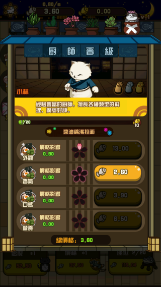 2.提升厨师的各项属性,可以提升菜品的质量以及售价。