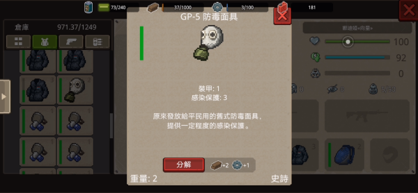 1、若暂时不需要 GP - 5 防毒面具,可点击 “分解” 按钮,将其分解为木材和齿轮等材料,用于后续制作或升级装备,合理利用资源。