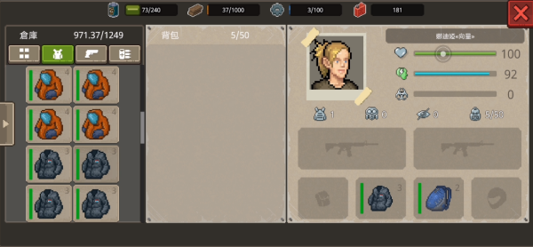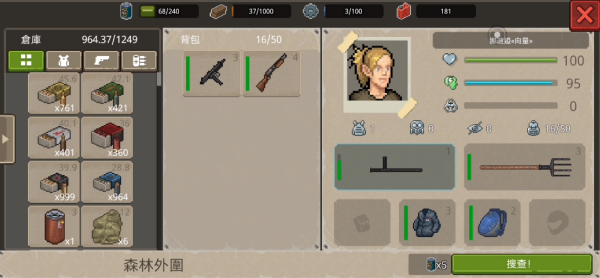 3、在 “森林外围” 场景,点击绿色 “搜查!” 按钮,开启区域搜查。利用背包中的枪械、三叉戟等武器,应对搜查过程中可能遇到的恶狼等敌人,同时收集木材、莓果等资源。