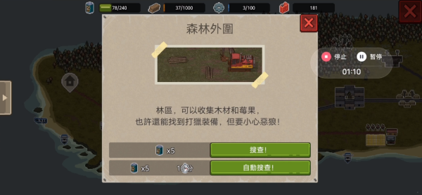 4、前往 “森林外围” 区域,可选择 “搜查!” 手动探索,能实时应对突发情况,收集木材、莓果和狩猎装备。