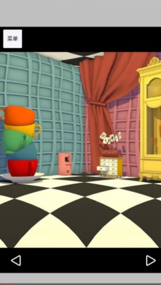2、观察场景中的彩色茶杯、扑克牌、柜子等元素,分别尝试与它们互动。