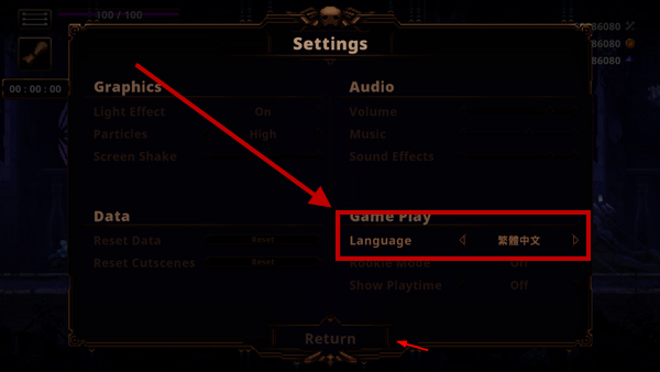 3.在设置列表中找到"language"选项,选择中文后点击return确认
