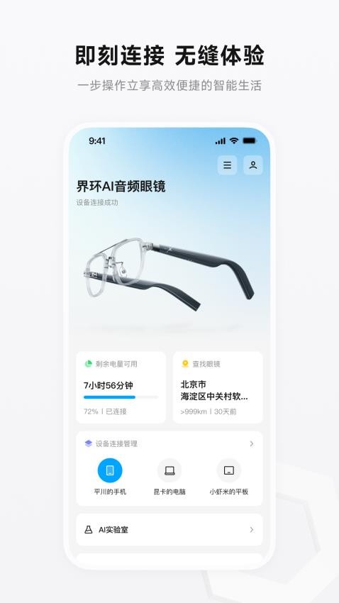 界环是一款适配界环ai音频眼镜的手机应用。它界面简单好上手,能让用户轻松搞定智能眼镜的连接与管理,畅享顺滑的智能生活。它带来便捷的管理体验,功能超多超实用。快速绑定、智能控制以及通知播报,让使用超方便。ai对话和同声传译,更是带来超智能的交互感受,很适合爱科技、求便捷的用户。