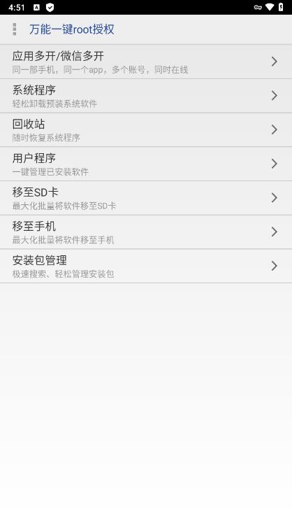 万能一键root授权是一款超厉害的手机管理神器,能帮咱轻松获取安卓手机root权限,摆脱系统束缚。它有好多实用功能,像获取权限、卸载系统软件、搬移应用、清理软件等,各种安卓机型都适用。不管是想卸预装软件、释放空间,还是把应用移到sd卡省内存,都能简单搞定,操作方便又高效,还能备份防误删。
