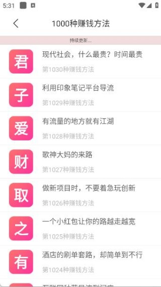2、点击顶部栏目,切换至赚钱方法,查看每日更新内容并收藏感兴趣的技巧与案例。