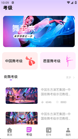 3. 点击页面下方的‘考级’,即可看到中国舞考级、芭蕾舞考级和街舞考级功能;