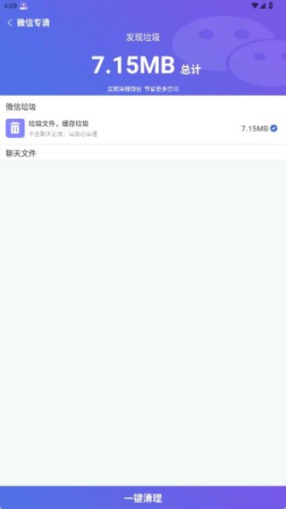 4、使用微信专清系统会自动识别聊天记录、图片、语音及缓存垃圾,并提供一键清理方案,让社交应用更顺畅。