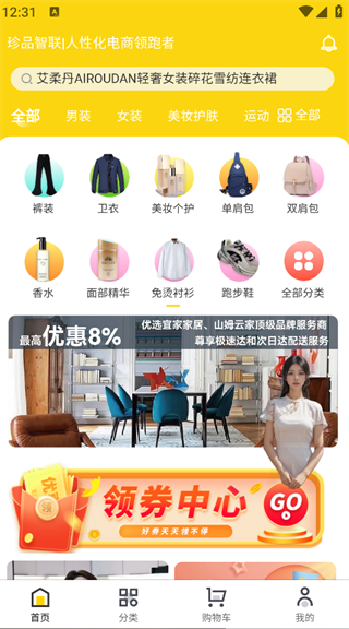 2. 在主页面即可看到清晰的商品分类和领劵中心等功能;