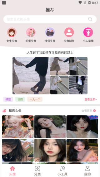 1、在头像页面中提供了女生头像、闺蜜头像、情侣头像、头像制作、小人举版等版块;