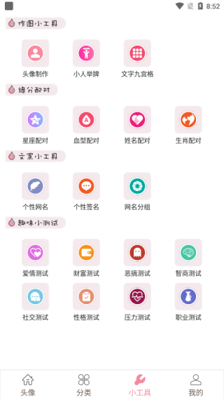 4、在小工具页面中提供了作图小工具、缘分配对、 文案小工具和趣味小测试等功能。