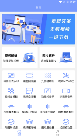 1、在首页中提供视频解析、图片解析、相册图去水印、相册图拼接、九宫格切图、视频变模煳、视频变清晰、取视频音乐等内容;