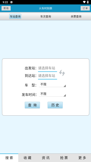 2、进入软件首页搜索板块,用户输入出发站和到达站车型和时间,可以一键查询火车信息;