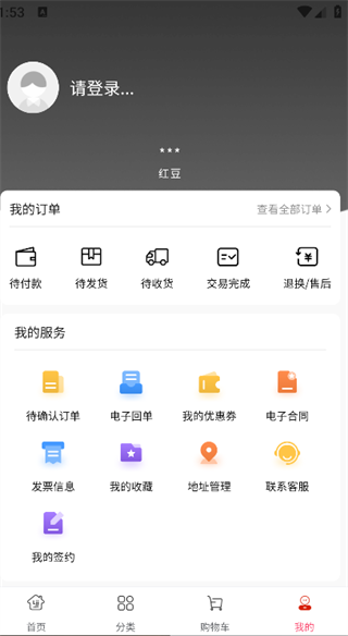 4. 点击页面下方的‘我的’,即可登录账号,查看我的订单、我的优惠劵、电子合同等。