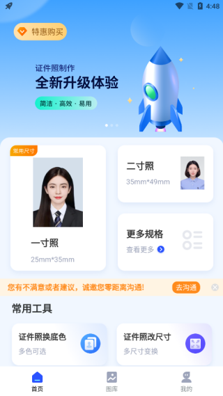 1、在首页中提供一寸照、二寸照以及更多规格,同时还有证件照换底色、证件照改尺寸等功能;