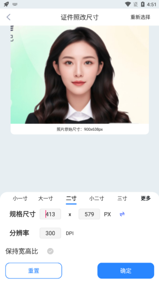 4、点击证件照改尺寸,选择你的证件照图片,然后进行输入规格尺寸,也可以选择对应的尺寸进行更改即可。