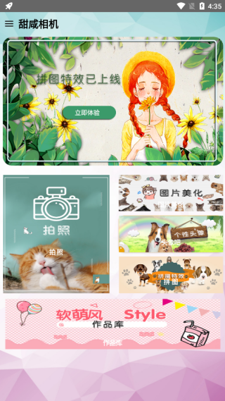 1、打开软件可以随时进行拍照、图片美化、头像吧以及拼图等处理,还有作品库资源;