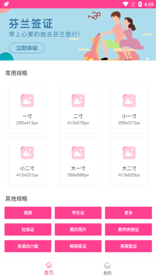 1、在首页中提供了常用规格和其他规格,同时还可以进行制作芬兰签证;