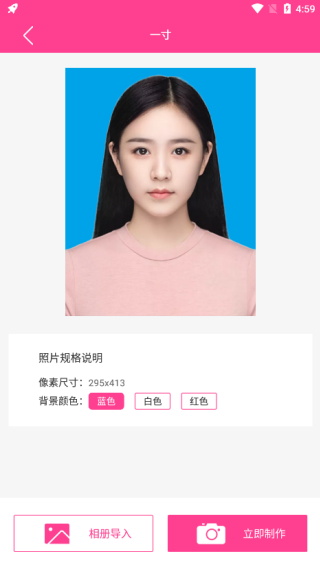 2、选择一寸后可以进行了解照片规格说明,点击立即制作或相册导入进行制作;