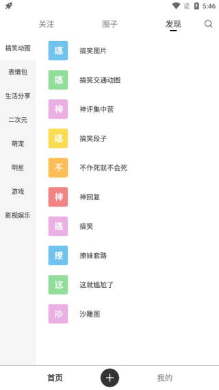 2、各种类别的资源展示界面,有着表情包、生活分享、二次元等栏目可以定制;
