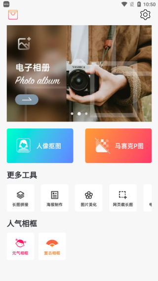 1、打开软件提供人像抠图、马赛克P图,同时还有长图拼接、海报制作、图片美化、网页截长图、元气相框、复古相框等功能;