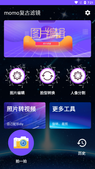 momo复古滤镜app超棒!它就是个复古相机,有自带的复古滤镜。不管是在线实时拍照,还是从手机相册上传照片,它都能把照片变成复古风格的老照片。而且这相机app既能拍照又能编辑图片,实用性超强,随时随地都能拍,完全能满足大家随时自拍的需求。