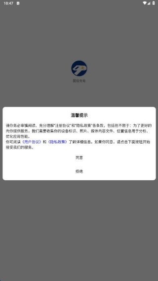 1、安装进入app,系统展示隐私政策和用户协议,点击同意;