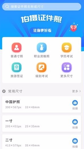 1、打开软件有普通寸照、职业资格照、学历考试、旅游签证、级别考试以及更多尺寸;