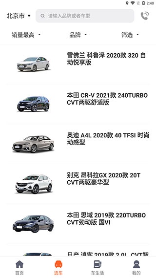 2、切换到选车界面,可以针对销量、品牌等条件进行筛选,以便快速找到您心仪的爱车;