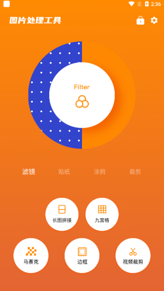 1、在主页面中有长图拼接、九宫格、马赛克、边框、视频剪辑功能;
