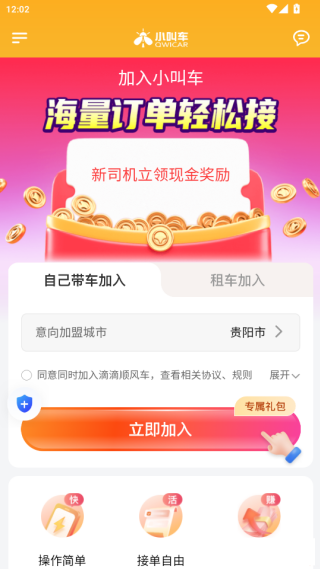 3、从自己带车加入、租车加入两种方式中任选一种方式加入选择意向加盟城市点击立即加入;