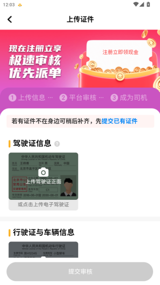 4、将你的驾驶证、行驶证与车辆信息上传后点击提交审核即可成功注册司机。