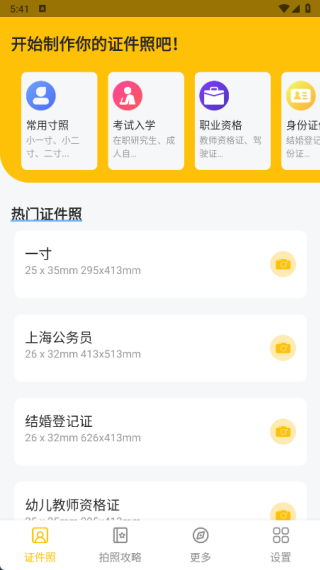 1、在证件照页面中有常用寸照、考试入学、职业资格、身份证件等功能;
