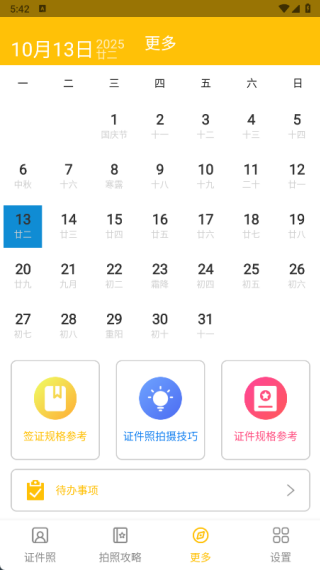 4、在更多页面中了解各类日历信息,还可以了解签证规格参考、证件照拍摄技巧以及证件规格参考的内容。