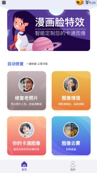 1、在首页中提供修复老照片、图像增强、你的卡通图像以及图像去雾等功能;