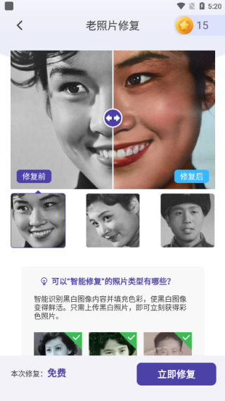 2、进入到修复老照片中,然后点击立即修复,再选择需要修复的图片进行修复即可;