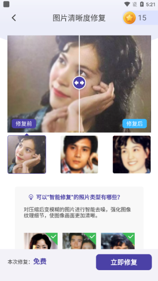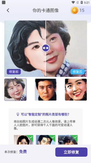 4、在你的卡通图像页面中点击立即修复,再选择图片进行快速的制作你的卡通图像。