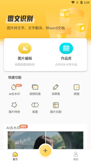 1、在首页中提供图片编辑、作品库,同时还有多种快捷功能;