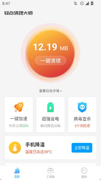 轻点清理大师app是一款超棒的手机垃圾清理软件哦!它能智能扫描出那些隐藏的垃圾,方便咱用户查看,然后及时清理掉,给手机留出更多空间,还能让手机运行速度变快呢。它功能超多,像垃圾清理、应用专清、文件管理啥的都有,能全方位提供优质清理服务。还有病毒查杀、手机加速、通知栏专清等一堆功能,咱能按需求自由操作。另外,它能提供超强省电服务,根据用电情况帮咱手机更持久地用电,再也不用担心长用手机没电啦。