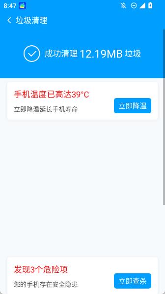 1、垃圾清理,可搜索手机上所有的垃圾文件,并可以及时清理;