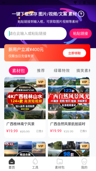 1、在首页中输入或粘贴链接即可快获取图片或视频的素材,同时提供多种素材包;