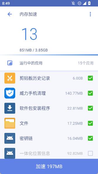 2、手机加速,一键即可释放手机内存,轻松告别手机迟钝;