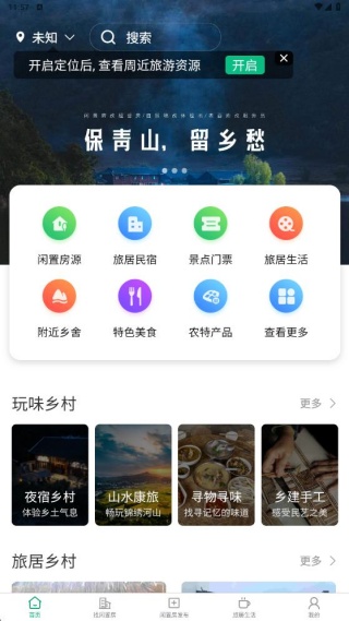 1、安装进入app,首页展示了旅居民宿、景点门票、特色美食、农特产品等板块;
