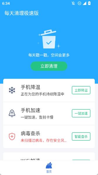 每天清理极速版app可是个超棒的手机垃圾清理神器!它能把手机里那些占空间的无用垃圾统统清掉,让手机存储空间大大释放,再也不用担心空间不够、垃圾过多,手机运行也不会卡顿啦!操作超简单,点一下清理图标,系统自动全盘扫描,一键就能放心清理,轻松解决卡顿问题,还有加速、微信专清等好多实用功能,快来体验吧!