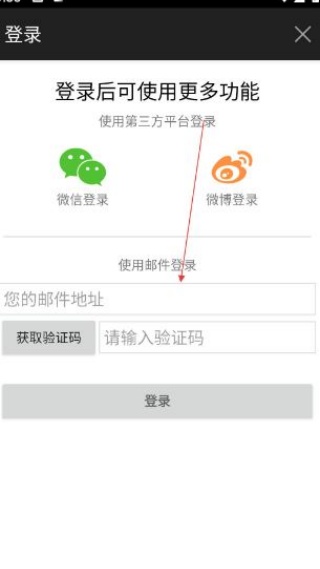 2、登录该APP,在页面选微信、微博或邮件登录,按流程录入信息,完成登录,解锁更多应用功能;