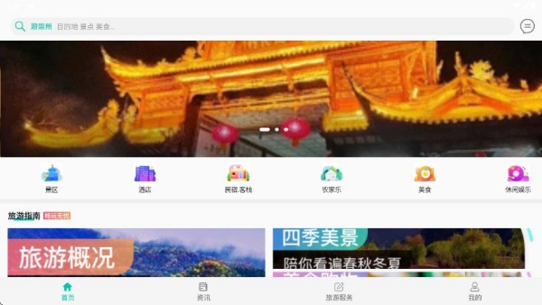 1、进入app首页,带来了景区、酒店、民宿等板块服务,还有旅游指南分享;