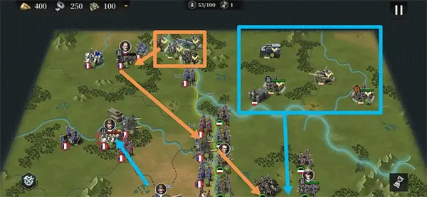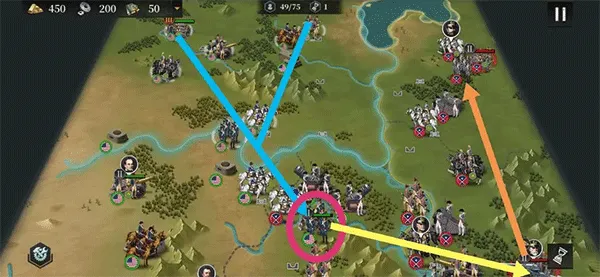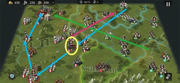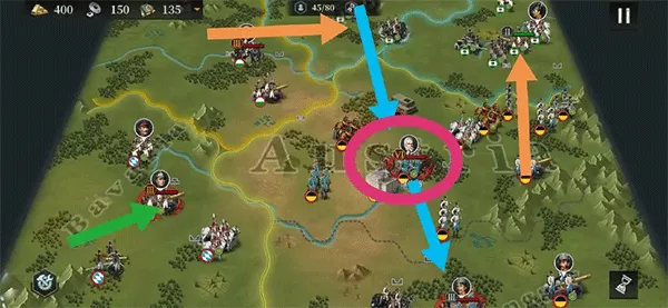 按路线行进,保护好红圈将。初始城用民兵守住,二级城的军事学院可造强行军。