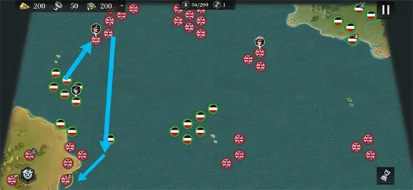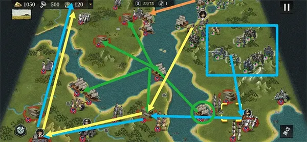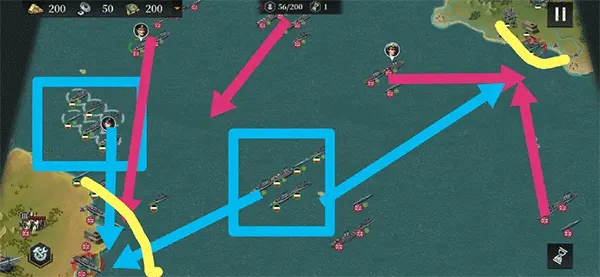 首先迅速突袭下方四级城,获取港口控制权,初始资金足够出六艘船(最好从护卫舰和巡洋舰中选择),海军沿绿线行军,清理岸边敌军;