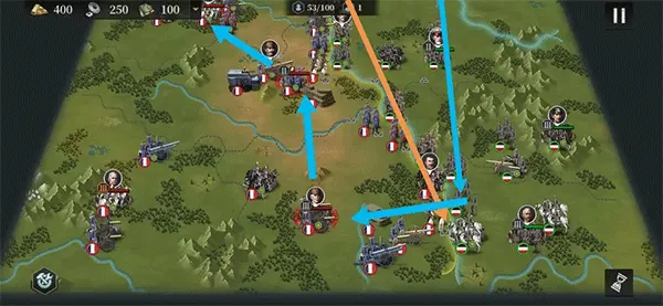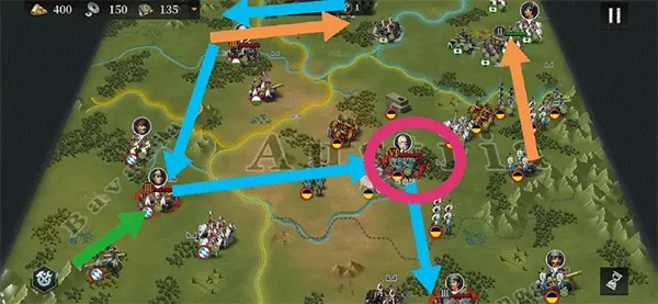 这关不要先占领上面的红圈城,否则会触发支援剧情,然后霞飞会带一波精锐之师来攻打你;