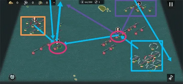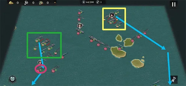 打掉绿圈将,绿圈将的队伍陷入混乱,可趁机拿下,中间上面的敌方舰队到达指定地点便不会移动了;