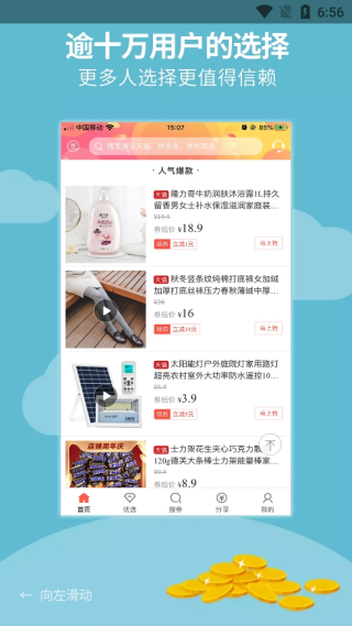 好券捕手app是一款全网优惠券聚合工具,通过智能捕捉商品折扣信息,帮助用户实现消费省钱。无论是服饰、美妆还是家居日用品,均可通过领取对应优惠券完成现金抵扣,优惠力度直接取决于券面金额,高面值优惠券可实现更大额度的消费减免。